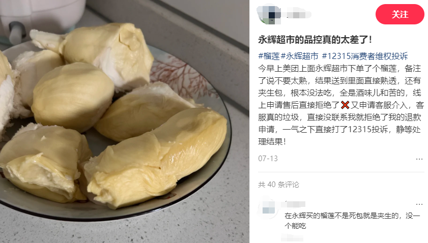 有人在美團上下單永輝超市的榴蓮,到手發現已經熟爛了,根本沒法吃,幾次想要線上申請售後,統統被拒,一氣之下打了12315投訴。