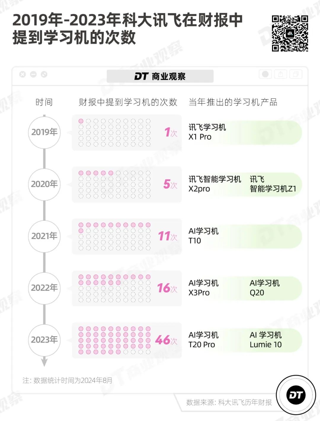 另一個可以側面論證的數據是,從2019年到2023年,在科大訊飛的年度財報中,學習機出現的次數明顯增加。