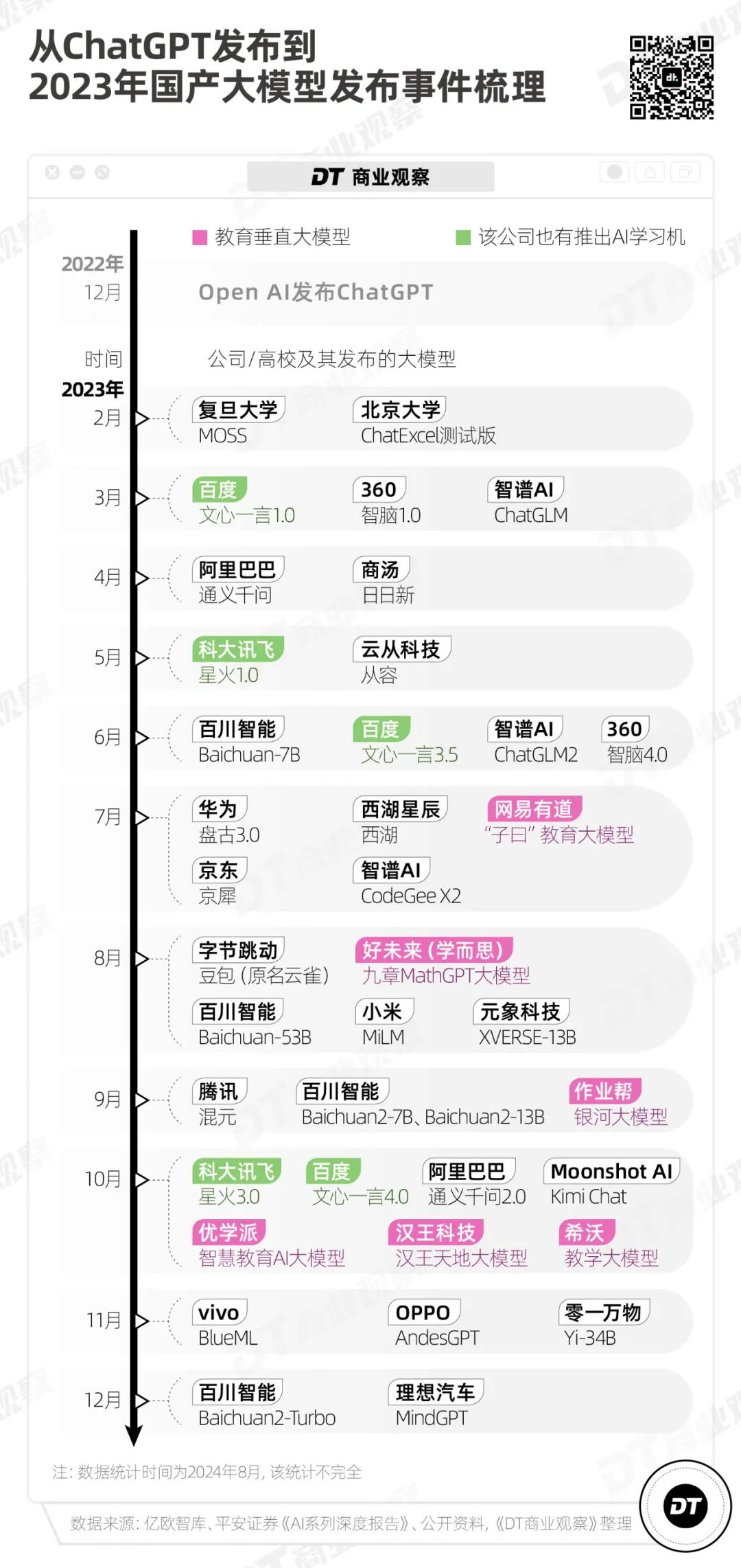 2023年2月,上海復旦大學和北京大學率先取得成果,分別推出MOSS和ChatExcel測試版。緊接着,科技派玩家們登場。3月,百度在北京召開新聞發佈會;5月,科大訊飛發佈星火大模型1.0版本。