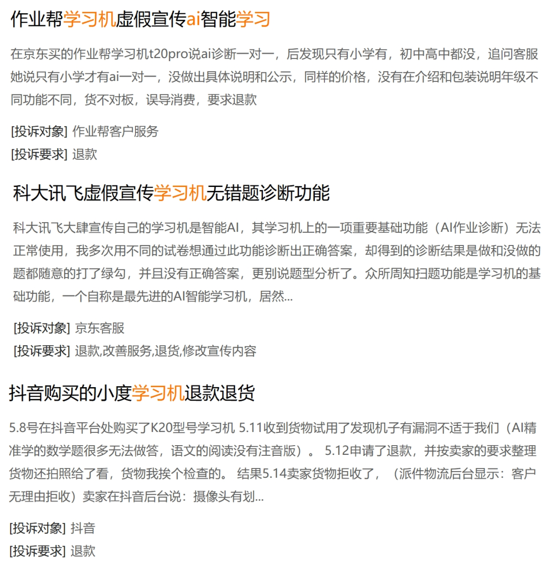 正如曾經,“9.11和9.9誰更大”的問題,難住了一眾AI;在黑貓投訴平台上,有關“AI學習機一點也不智能”的投訴並不在少數。