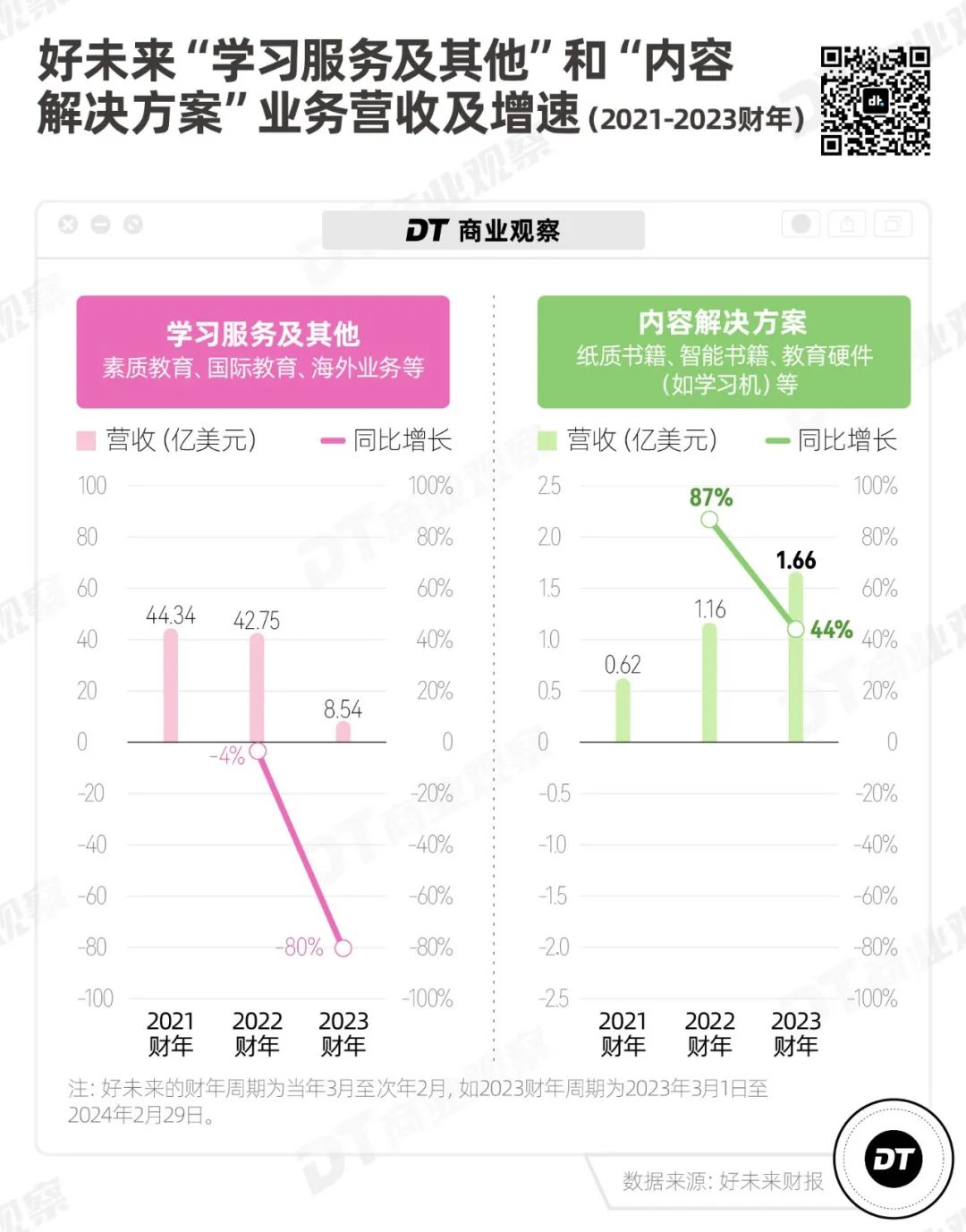 好未來的業務主要有兩大塊:一是學習服務及解決方案,包含素質教育、國際教育、海外業務等,是主要營收來源。二是學習內容解決方案,包含紙質書籍、教育硬件等。