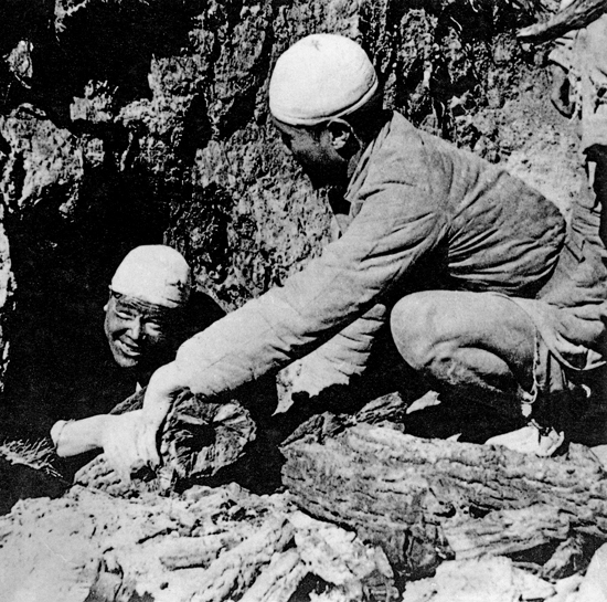 一名士兵拿着工具鑽進一口新挖的窯洞裏。他的任務是儘快完成這個窯洞,然後再抓緊時間燒製木炭,為即將到來的寒冷冬天做準備。