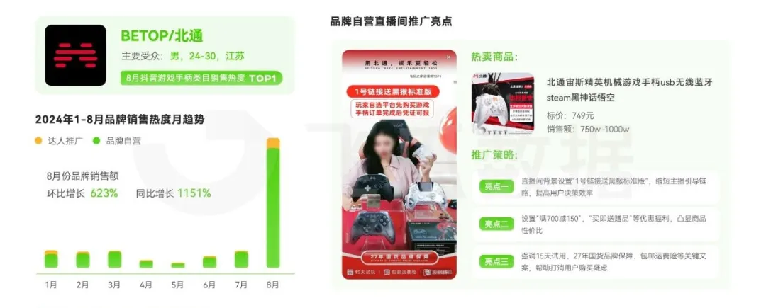 最終,「北通」8月份銷售額環比上月增長623%,且較去年同期增長1151%,打破品牌歷史銷售紀錄,也讓品牌成功登頂【遊戲手柄】品類月榜TOP1。