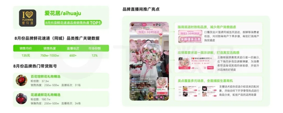 比如品牌「愛花居」的關聯直播間以花店為背景來打造真實選購感,搭配貼片文案“鮮花1-3小時送達”,有效增強了消費者對商品的確定性,進而提升購買意願。此外,品牌還針對開學季、教師節等場景,對旗下商品進行講解,使其能有效滿足不同觀眾的購買需求。最終,品牌憑藉750w-1000w的月銷售額,登頂8月抖音鮮花速遞品類銷售額TOP1。
