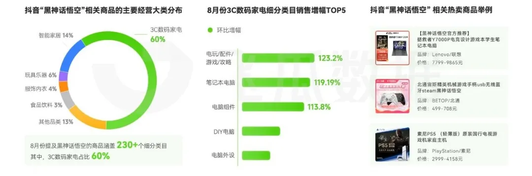 商家們自然也不會錯過這場“潑天的富貴”。據飛瓜統計,8月份提及《黑神話·悟空》的商品涵蓋了230+個細分類目。其中,來自3C數碼家電、智能家居、玩具樂器經營大類的商品數佔比位居TOP3,分別為59.7%/14.2%/6.2%。