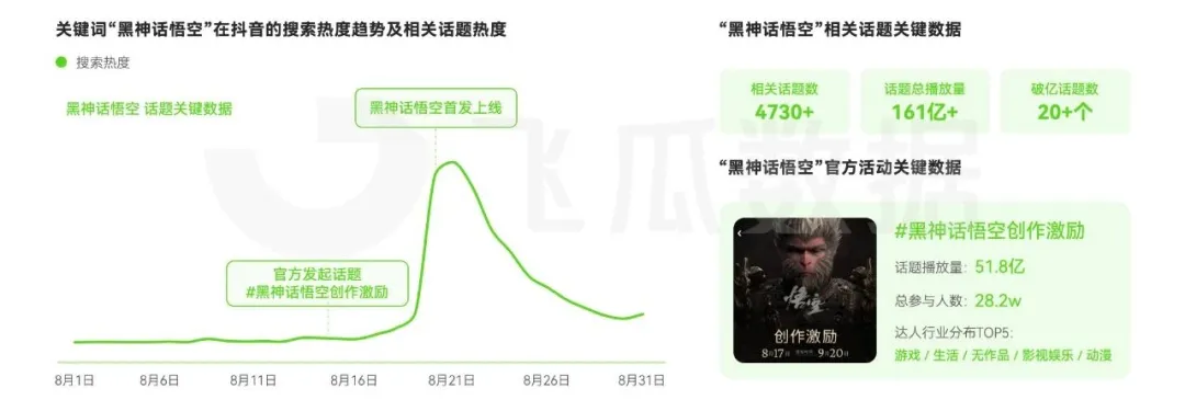 8月20日,首款國產3A遊戲大作《黑神話:悟空》上線即爆,熱度席捲全網。在抖音平台,圍繞該遊戲的內容創作也層出不窮。抖音官方更是同步發起#黑神話悟空創作激勵 專題活動,鼓勵用户參與話題拍攝及開設直播。