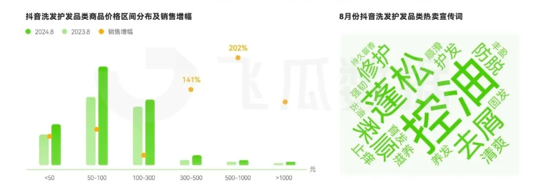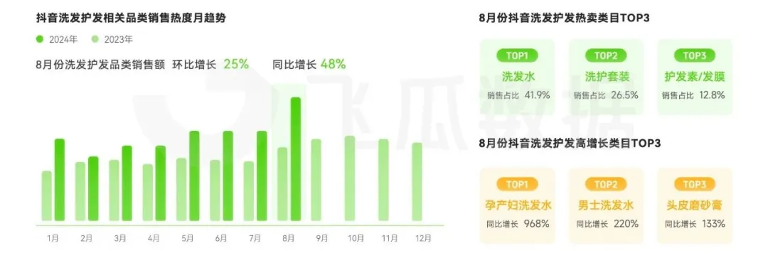 近年來,“顏值經濟”的盛行催生了消費者對洗髮護髮產品的新需求,帶動洗護市場規模穩步增長。在抖音平台,洗髮護髮品類也表現出強勁的增長勢頭,8月份銷售額環比增長25%,較去年同期增長48%,市場穩步擴容。