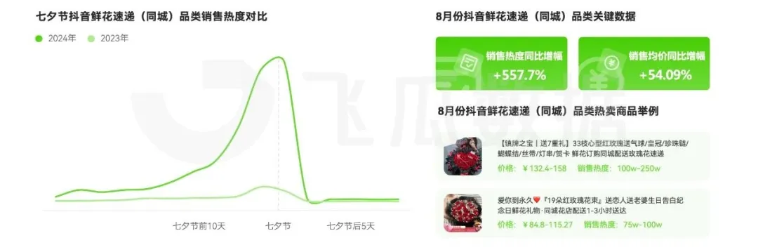 結合日趨勢圖,可以看到鮮花速遞(同城)品類在今年七夕節期間的銷售熱度爆發期晚於23年七夕。品類的銷售也因此大幅提升。據飛瓜數據統計,8月份抖音鮮花速遞(同城)類目的銷售熱度同比增長557.7%,銷售均價同比增長54.09%。側面反映抖音用户的同城消費心智正逐漸養成,有利於後續本地商家的引流轉化。