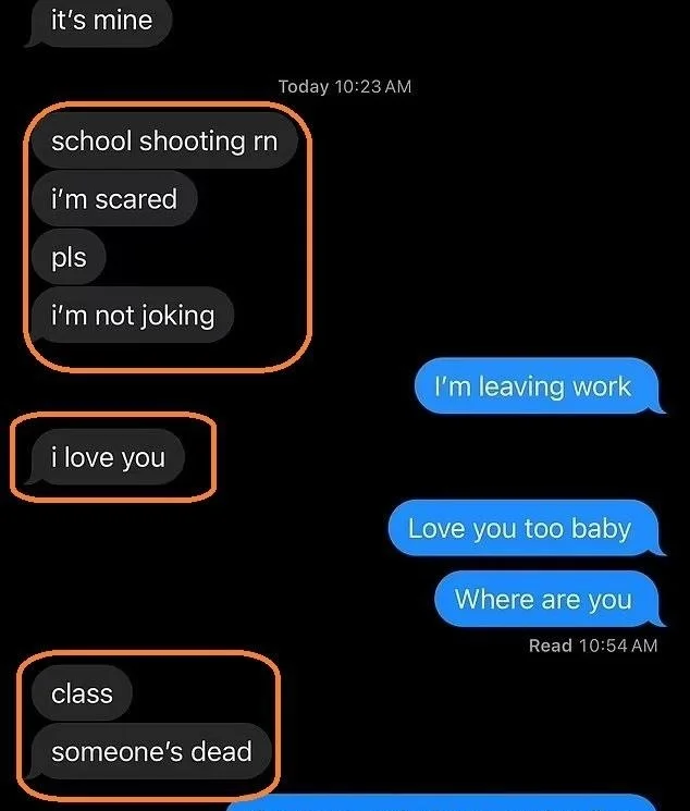 “學校正在發生槍擊。我很害怕。我不是在開玩笑,”伊森這樣寫道。艾琳迅速地回覆了孩子,稱自己馬上下班。