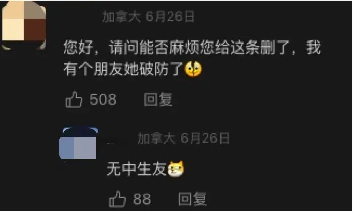 “您好,請問能否麻煩您把這條刪了,我有個朋友她破防了(裂開)”