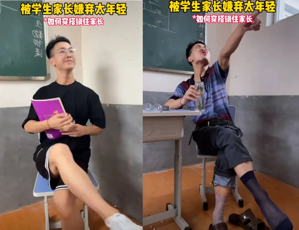 哪怕借了爸媽大姨大伯們的衣服來穿,把頭髮梳成大人模樣,還是有可能會被“救命”“笑死”的口頭禪暴露,又或是因為訓完學生後面向黑板時忍不住偷笑而被識破。
