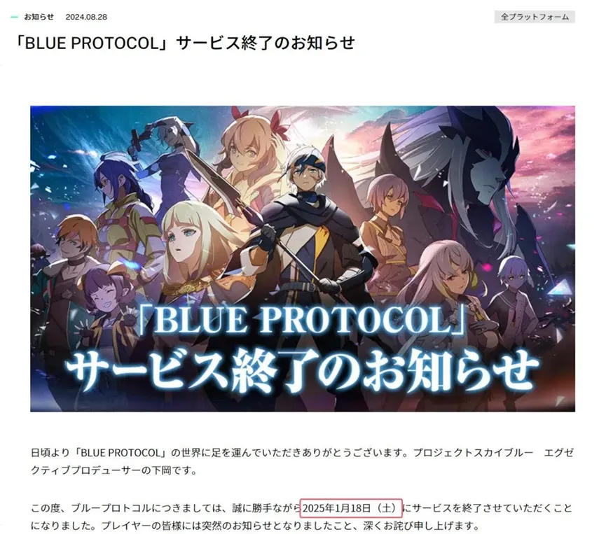 前幾天,由萬代南夢宮開發運營的MMO網遊《藍色協議》宣佈將於2025年初停服,本作日服於2023年6月14日正式上線,總共運營時間滿打滿算也就只有14個月。
