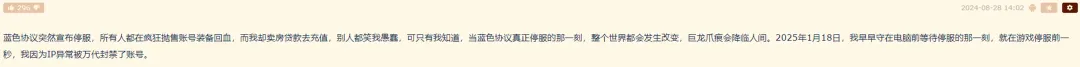 可惜,《藍色協議》幾乎是出道即巔峯了。遊戲爆火後不是想着去擴充服務器,反而腦回路清奇地去封外國玩家的ip,主打一個“解決不了問題就去把產生問題的人解決了”。