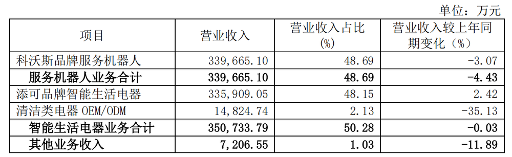 根據財報,按照業務構成劃分,科沃斯擁有服務機器人業務、智能生活電器業務、其他業務三大業務板塊,而服務機器人業務細分下的科沃斯品牌服務機器人收入為33.97 億元,同比下降3.07%,拖累服務機器人業務同比下降4.43%。此外,智能生活電器業務收入和其他業務收入也分別同比下降0.03%和11.89%。