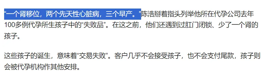 因為胚胎質量問題,或受外部環境影響等等複雜的因素,代孕媽媽也可能生出不健康的小孩,客户無法接受,機構只好單獨處理他們。