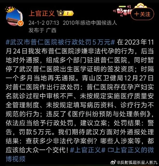 武漢一家醫院涉嫌非法代孕,處罰5萬元。