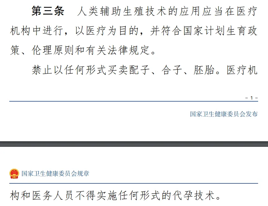 根據《人類輔助生殖技術管理辦法》:“禁止以任何形式買賣配子、合子、胚胎。醫療機構和醫務人員不得實施任何形式的代孕技術。”