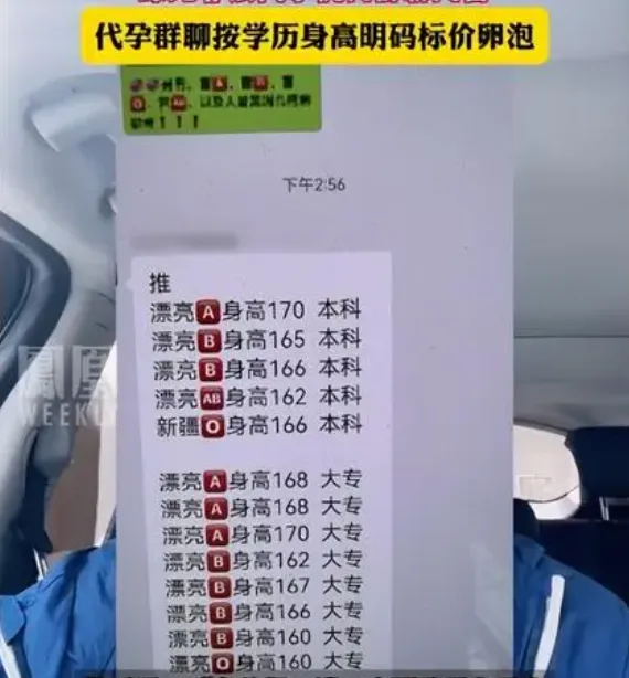 代孕羣裏,女孩們的信息被分門別類,根據學歷身高外貌年紀的不同,卵泡價格也不同。