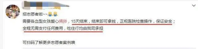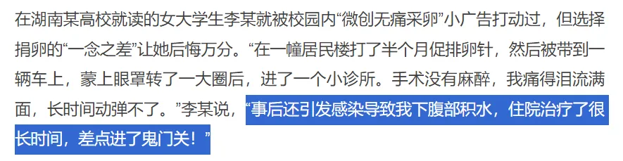 它們打着“無痛無害採卵”的旗號,哄騙到很多年輕女孩,尤其是經濟困難、有助學貸款的女孩,讓她們以為真有輕鬆又來錢快的好事。