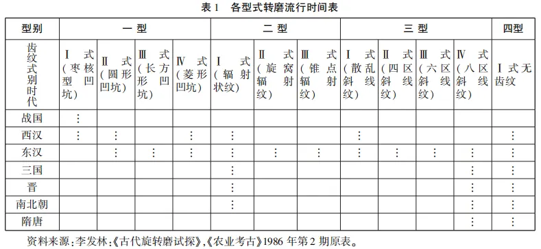 餅的上述特點可能從側面印證了兩個問題,第一,轉磨的進步。因為磨的進步,麪食加工成為了可能,小麥的食用實現了從麥飯到餅的轉變,從而上至宮廷,下至民間,麪食均被廣泛接納。根據李發林的總結,“東漢、三國時期,是轉動磨磨齒多樣化的發展階段。……可以説東漢三國時期是古代轉磨發展史上數家爭鳴、數花齊放的時期。”。通過表1對轉磨考古發掘的總結,可以清晰看出,從西漢到東漢,轉磨的類型極大豐富了,這種豐富説明這一時期的轉磨得到了改良,説轉磨此時有了質的飛躍也並不為過。