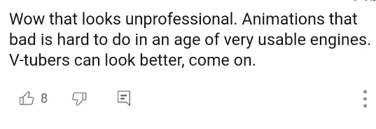 “我丟啊這遊戲感覺也太不專業了,在如今真的很難做出如此糟糕的動畫了,Vtuber的效果比你都好,真搞笑。”
