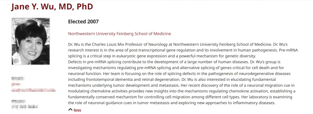 據悉,吳瑛出生於 1963 年,1986 年在上海醫科大學獲得醫學學士學位後赴美,1991 年在美國斯坦福大學獲得腫瘤生物學博士學位。1994 年在哈佛大學完成博士後訓練後,分別在聖路易斯華盛頓大學、範德比爾特大學歷任助理教授、副教授和教授,2005 年在西北大學範伯格醫學院任教至今。她主要從事神經發育和神經退行性病變的基因調控的分子機制研究。