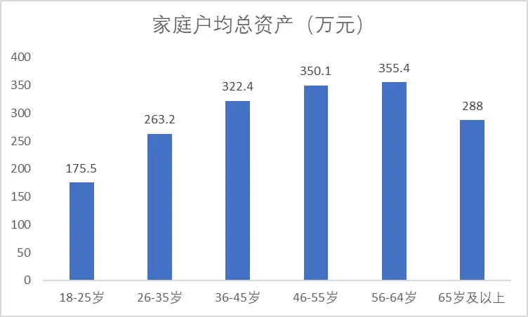中國人民銀行發佈的《2019年中國城鎮居民家庭資產負債情況調查》裏,2019年中國56-64歲羣體的户均總資產高達355.4萬元,高居第一;65 歲及以上羣體的户均總資產達到了288萬元,也相當高了。可見中老年人家庭總資產較高,年輕人佔有的財富較少。