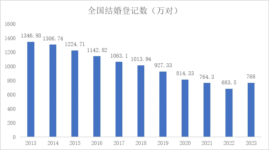 自從2013年達到峯值後,國內結婚登記數量幾乎就是逐年遞減,可見年輕人是越來越不想結婚了。