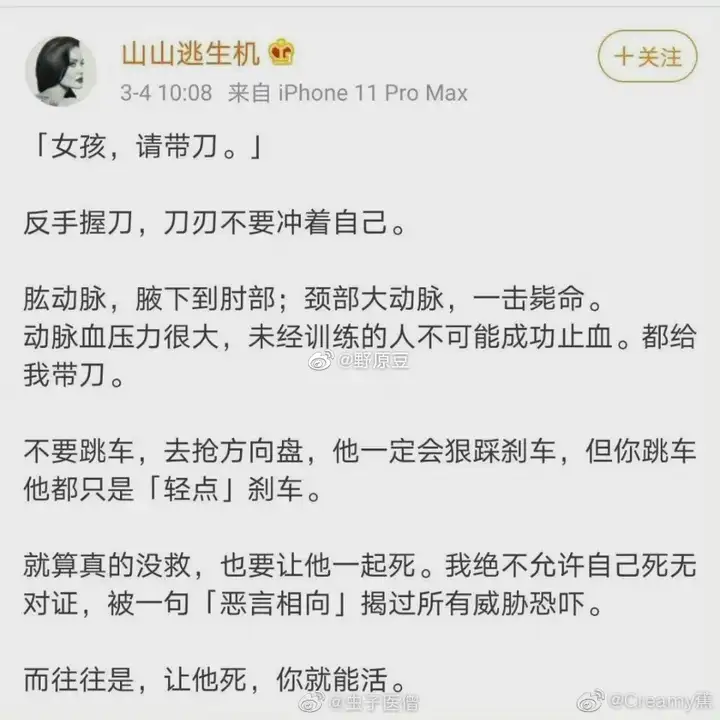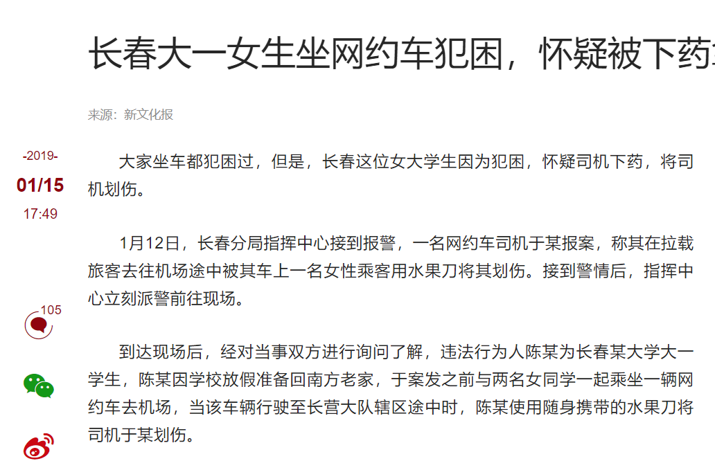 比如説前面提到的各種女乘客和男司機糾紛,為什麼那麼多女乘客坐車會帶一把水果刀?恐怕和網上這種説辭很有關係。