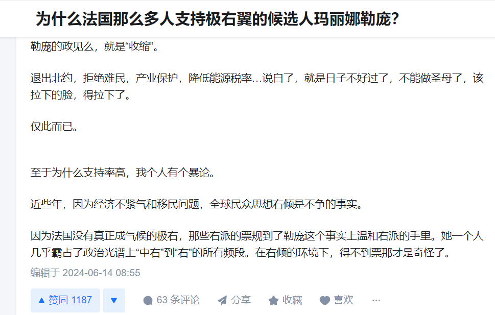 短短10年不到,現在歐洲整體已經特別反感穆斯林羣體了。一個顯著信號,就是歐洲各國民粹主義氾濫,各種右翼政黨獲得了越來越多的選民支持,代表就是法國的勒龐,以及德國的選擇黨。