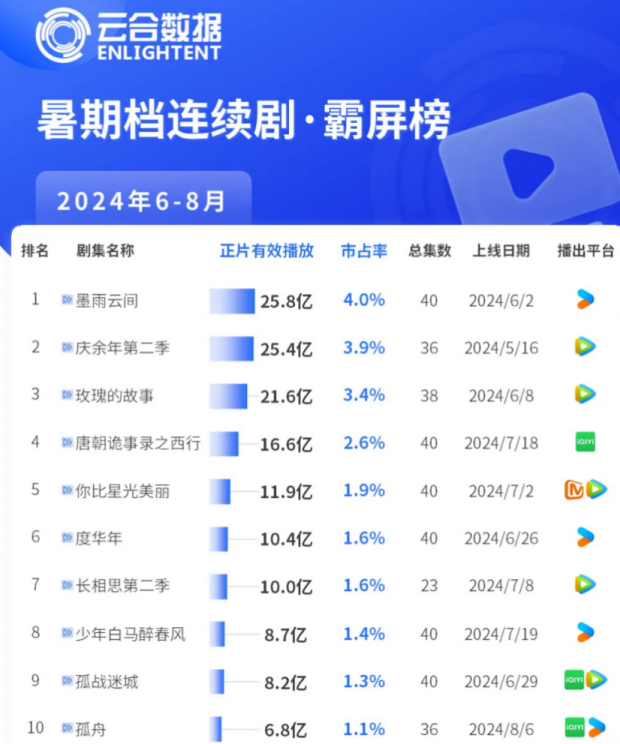 雲合數據剛剛發佈的2024劇集暑期檔報告顯示,位列第一的是優酷的《墨雨雲間》,第二、三位分別是騰訊視頻的《慶餘年第二季》《玫瑰的故事》。