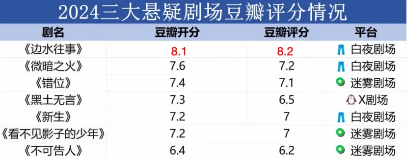 從豆瓣評分來看,優酷白夜劇場《邊水往事》、《微暗之火》和《新生》分列今年懸疑劇豆瓣評分第一、第二和第五位,在Top5中佔據三席,此外,愛奇藝迷霧劇場、騰訊視頻X劇場分別佔據一席。