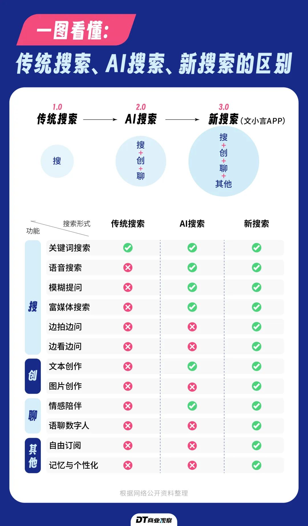 隨着搜索從「提供信息」向「理解需求」再到「情感互動」的轉變,AI 驅動的新搜索正在超越傳統邊界,看起來,文小言是這一趨勢下的積極探索者,它的出現,也可以看作是一次搜索從工具向夥伴的進化嘗試。