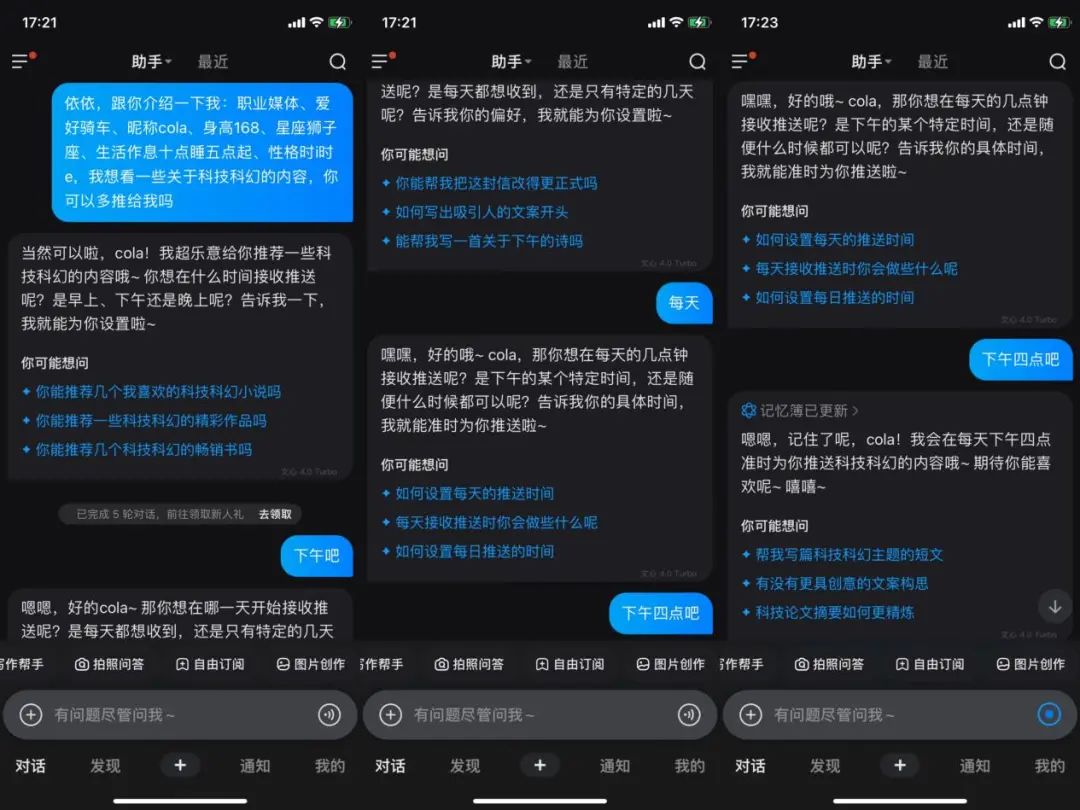 今天在啓用「文小言」這個助手之前,可以先進行一番喜好設置。只需要告訴文小言需要記住的內容,包括職業、愛好、暱稱、姓名、年齡、身高、屬相、星座、性別、興趣愛好、偶像、未來計劃、生活作息、性格等,文小言就可以像朋友一樣記得用户的喜好,提供個性化的內容輸出。