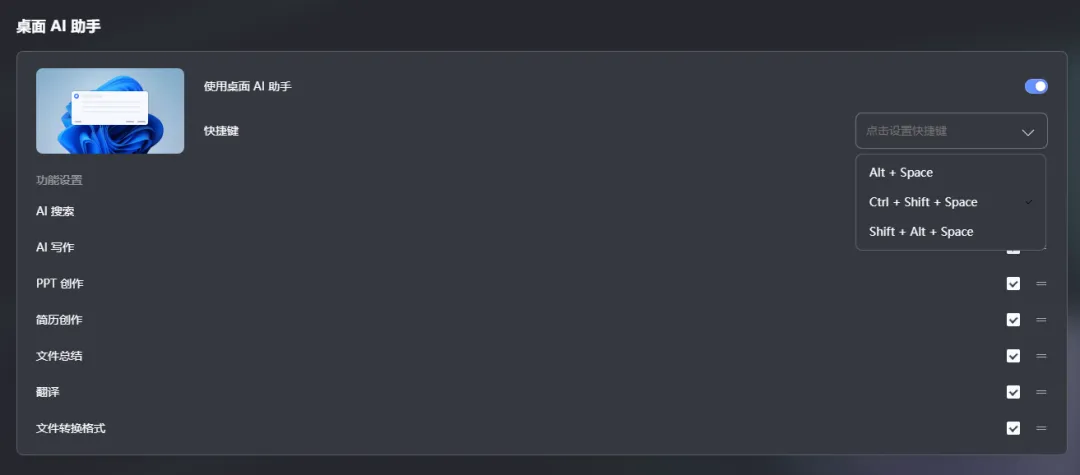 但一個可大可小的問題,出現在開始使用之前:桌面AI助手必須由快捷鍵喚起,用户可根據使用習慣自行設置快捷鍵,如果快捷鍵衝突,系統會提示。