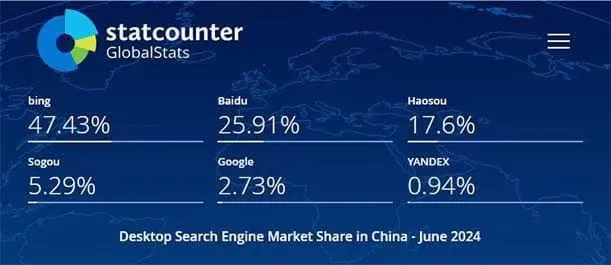 市場調研機構Statcounter發佈的中國搜索引擎市場份額報告顯示,2024年6月,微軟Bing、百度以及“HAOSOU”(曾是360搜索域名,但早已變更)分別以47.43%、25.91%和17.60%的比例,佔據了國內桌面搜索引擎市場超過90%的整體份額。