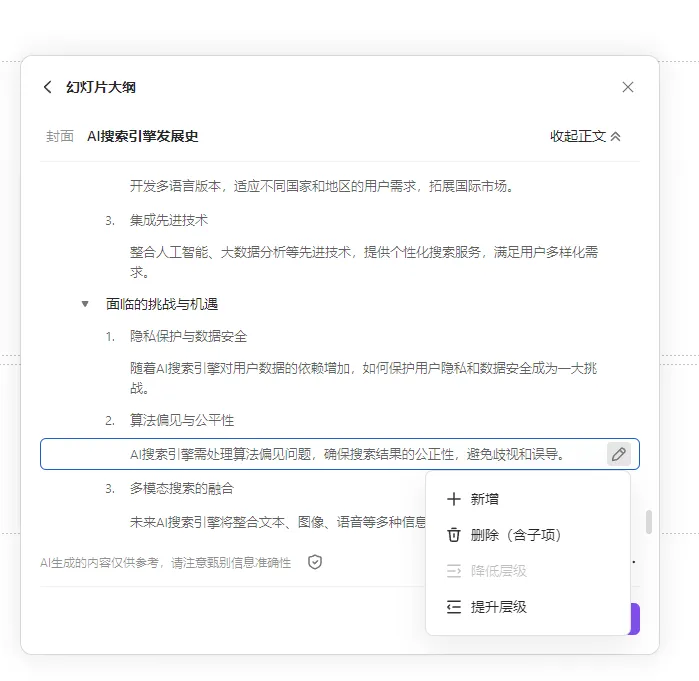 WPS AI在生成大綱之後,加入了可手動編輯的選項,並可以單獨調整某一段信息的前後位置。