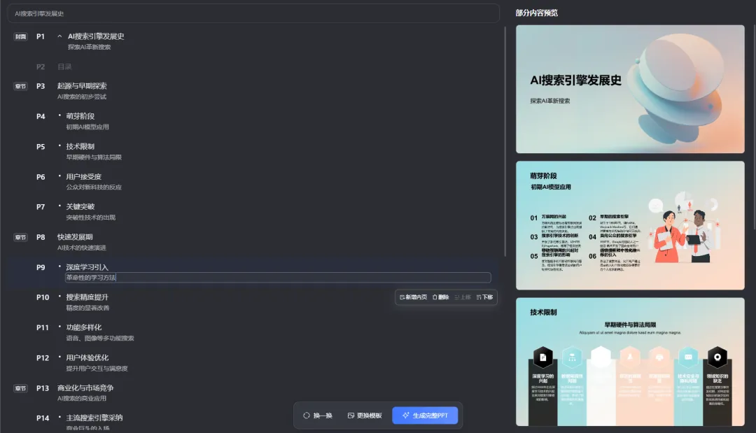 而夸克的AI PPT功能,在大綱內容可自由編輯、調整順序的基礎上,還根據事先選好的模板生成了更為直觀的部分頁面預覽。