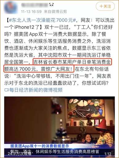 美團曾經爆出過一份消費數據:一位東北大哥在洗浴中心一天就消費了7000多元,相當於洗掉了一台新款的iPhone。