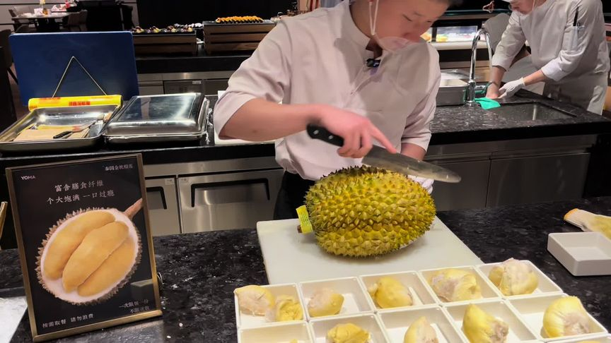 在開飯前,會有專人當着食客的面開榴蓮,雖然開出什麼樣的榴蓮肉全憑運氣,但這麼玩也有種開盲盒的快感。