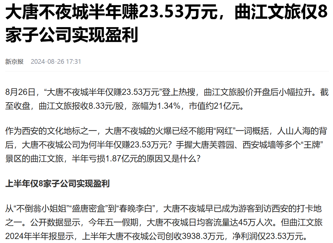 曲江文旅的資產裏裝着大唐不夜城,這家上市公司上半年營收7.7億元,虧損1.88個億。