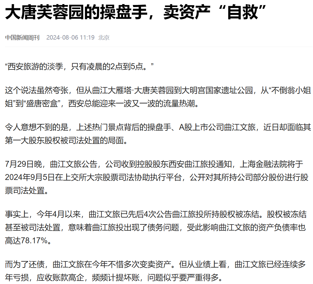 這邊藉着,那邊欠着,搞得曲江文旅大股東的股權幾次被司法凍結。