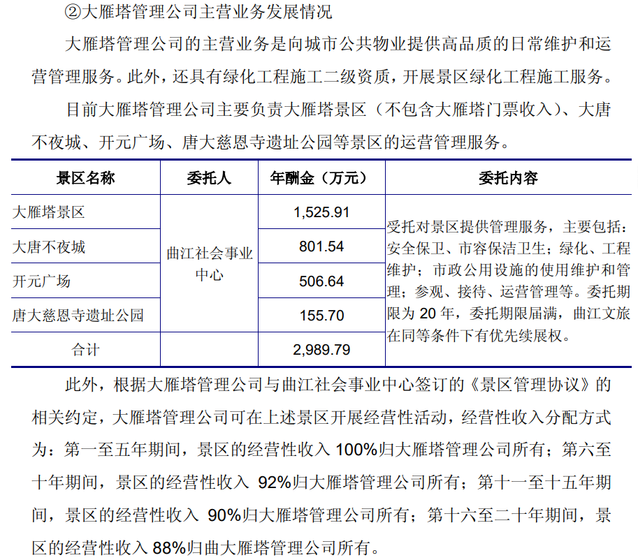 大唐芙蓉園景區也跟曲江文旅簽了20年的協議,曲江文旅就從景區的門票收入中拿自己的管理酬金。