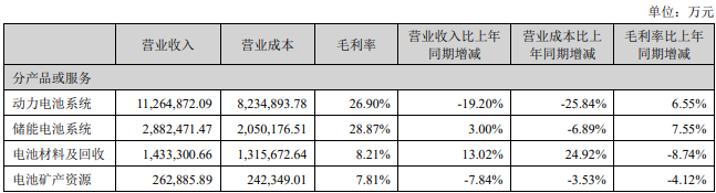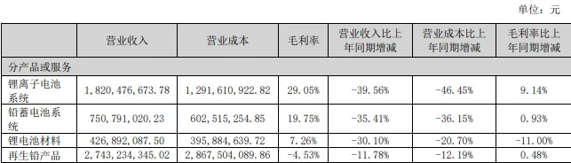 此外,南都電源的情況也不容樂觀。不僅是鋰離子電池系統業務營收下滑了39.56%,其他如鉛蓄電池系統、鋰電池材料業務的營收也同樣下滑超過30%。