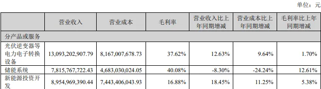 不過儘管各家的儲能相關業務毛利率表現不錯,但在激烈競爭的市場中,也並非所有玩家都能賺的盆滿缽滿。比如作為頭部企業的陽關電源,儘管儲能系統的毛利率遙遙領先,但營收同比卻下降了8.3%,營收額為78.16億元,也是陽光電源上半年唯一出現負增長的主營業務。