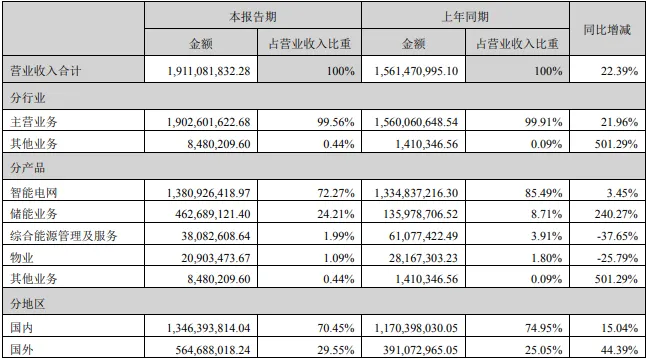值得一提的是,科陸電子成為儲能業務同比增長最高的企業,達到240.27%,儲能業務營收為4.62億元,佔總營收的24.21%。其中國外業績增速明顯,達到44.39%,營收佔比已經接近30%。