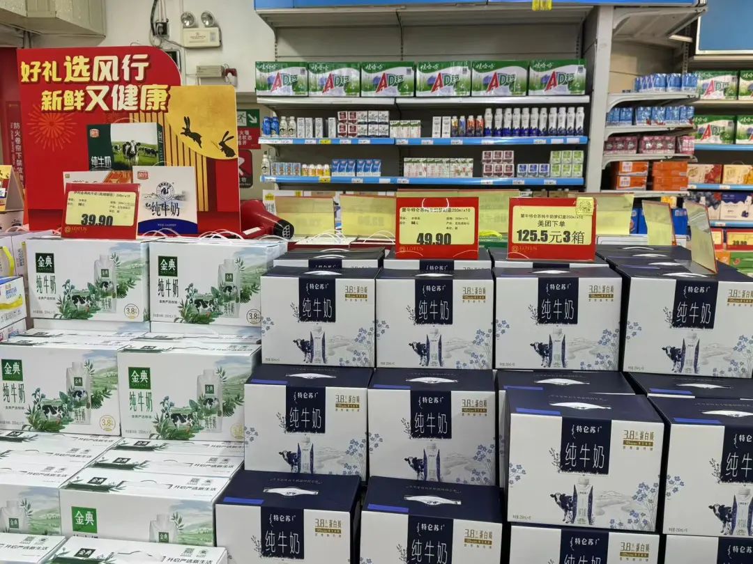 時代財經走訪廣州天河區某連鎖超市,超市牛奶區4個喇叭均在播放促銷信息。原價40元的12瓶裝本土品牌純牛奶促銷價為19.9元,伊利和蒙牛旗下高端線金典、特侖蘇牛奶售價低至39.9元/箱、49.9元/箱。