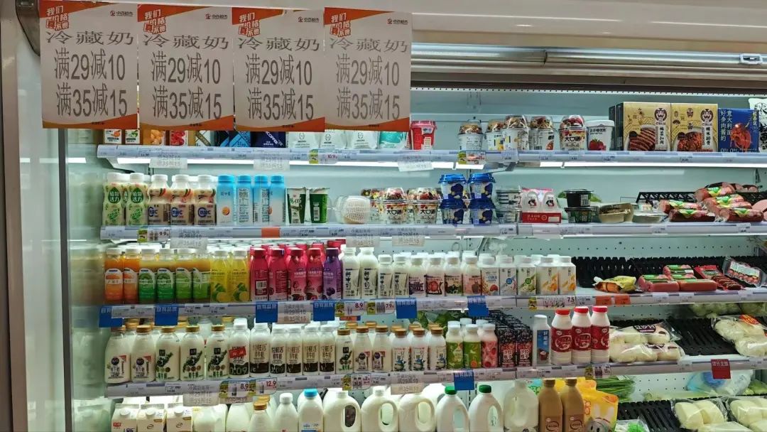 冷藏奶“滿29-10”“滿35-15”,去逛本地連鎖超市時,王茜發現超市中牛奶的價格越來越便宜,特侖蘇、金典等高端常温液態奶也時常有優惠。