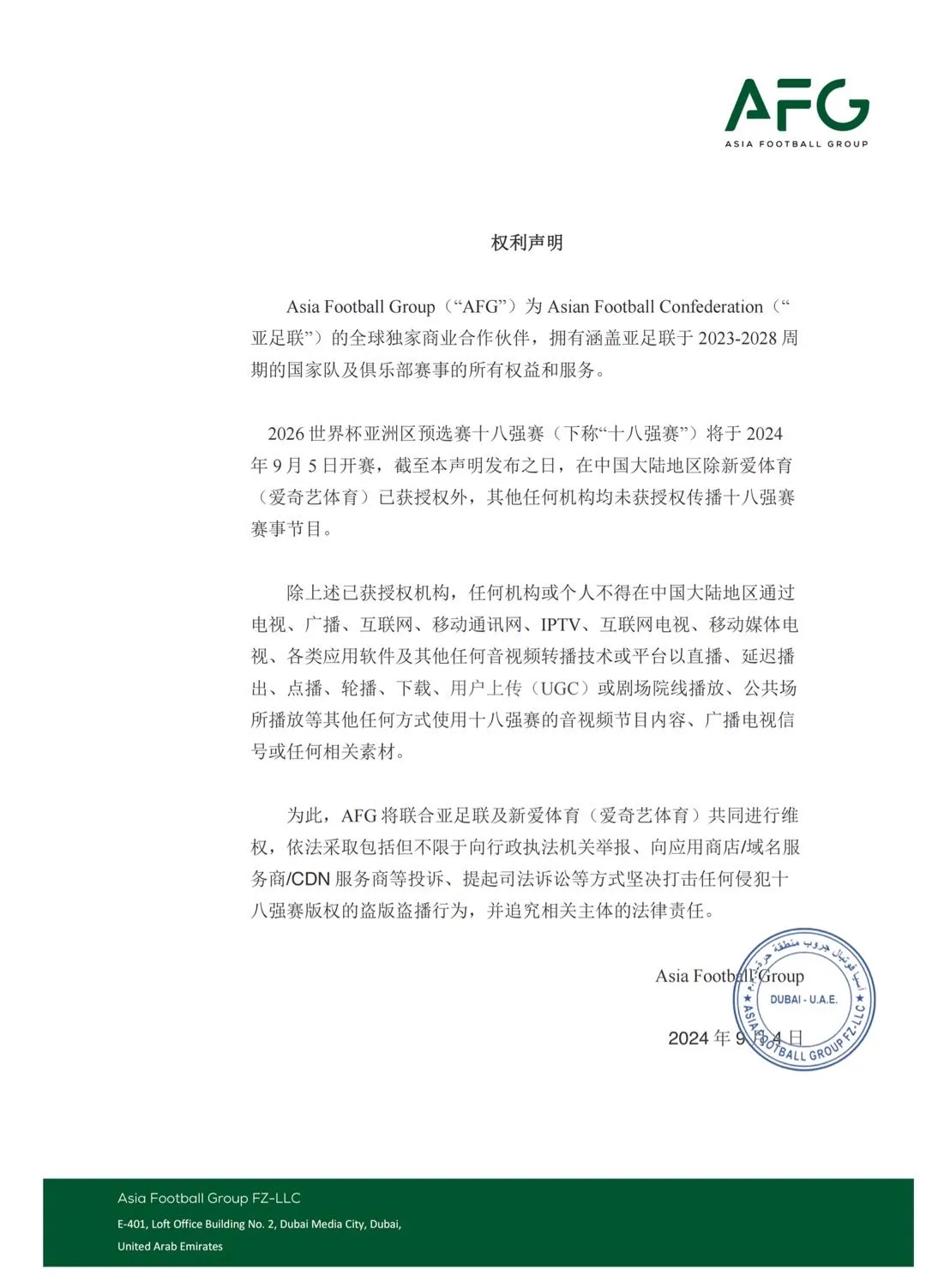 根據亞足聯獨家商業合作伙伴AFG在9月4日發佈的公告表示,截至9月4日,在中國大陸地區只有新愛體育(愛奇藝體育)獲得了亞足聯的授權。換言之,愛奇藝體育是本次中日之戰的獨播方。