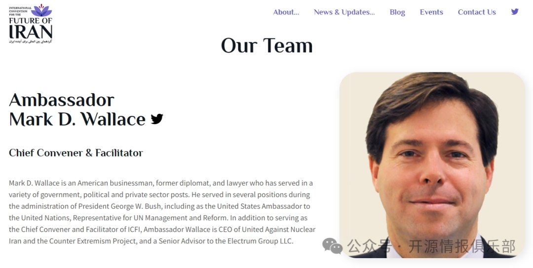 這個陰暗組織網絡一切的核心是馬克·華萊士,他是小布什政府的前駐聯合國大使,同時是聯合反對核伊朗組織(UANI)、支持伊朗女性生活自由的猶太委員會(JCWLF)、反極端主義項目(CEP)、Panthera組織、伊朗未來國際公約(ICFI)**、**土耳其民主項目(TDP)這幾個組織的創始人或負責人,甚至還有一家專注於伊朗人權的藝術非營利組織PaykanArtCar。